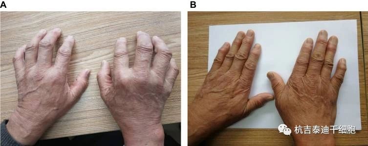 類風濕性關節炎的干細胞療法綜述源自黃的研究。一名68歲男性于1998年被診斷出患有RA。( A )顯示患者的雙手無法保持伸直。(二)治療后三年,已停止使用抗風濕藥五年,雙手伸展自如,關節周圍的風濕結節逐漸變軟、消退。(3)