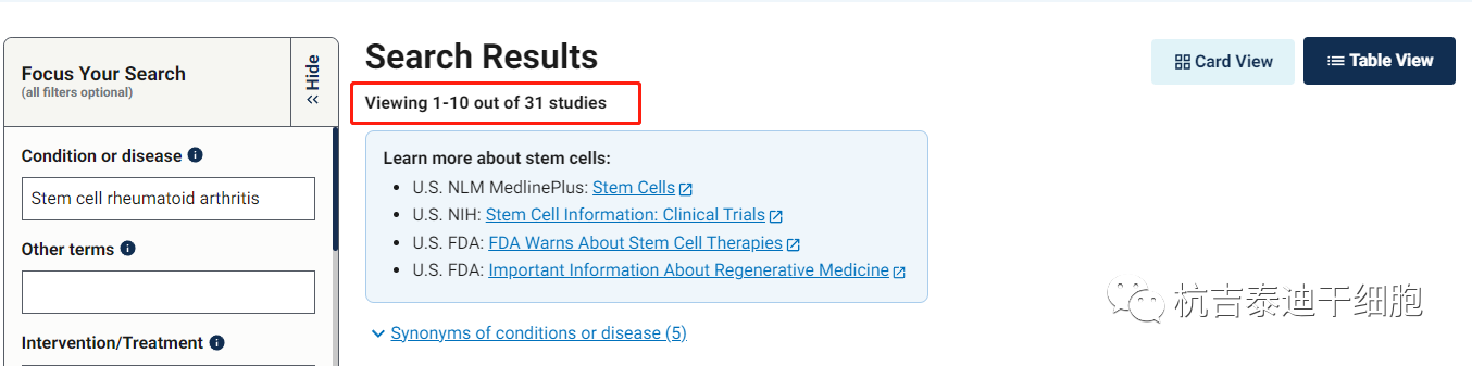 截止2023年6月,在美國國立衛生研究院的最大臨床試驗注冊庫clinicaltrials.gov網站上注冊的有關干細胞治療類風濕關節炎的臨床研究項目有31項。