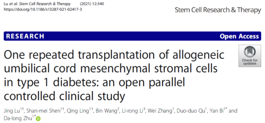 2021年,南京市鼓樓醫院內分泌科朱大龍教授團隊,在Stem Cell Research & Therapy發表了《臍帶間充質干細胞在1型糖尿病重復移植:一項開放、非隨機、平行對照臨床試驗》[3]。