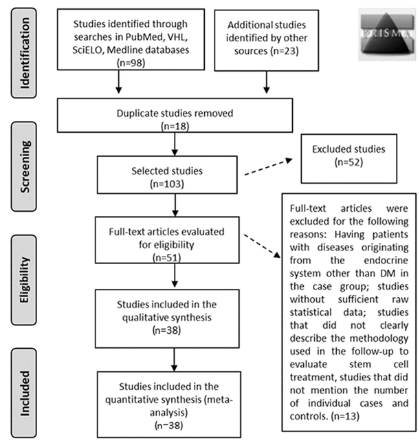 來自PubMed、SciELO、BVS、Medline等數據庫,38篇原始文獻,包括647例對照病例和654例治療病例,對1型糖尿病和2型糖尿病患者進行3、6和12個月的隨訪(圖1)。通過比較治療前后的空腹血糖和C肽水平等實驗室指標,驗證干細胞治療的有效性。