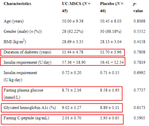 在37名接受臍帶間充質干細胞治療的患者中,有5名患者在干細胞治療后 (12±7.6周達到無胰島素水平,并在37.2±15.2周內也沒有再次使用。相比之下,安慰劑組的患者則必須依賴胰島素治療。