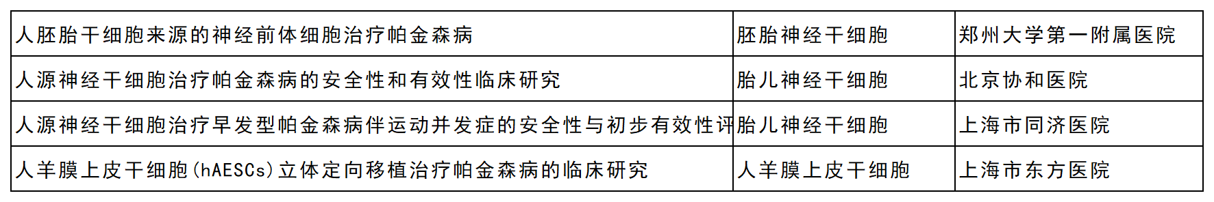 | 孤雌生殖神經(jīng)干細(xì)胞 | 紋狀體和黑質(zhì)腦內(nèi)注射 | 十二名患者/(NCT02452723) | 2016–2018 |