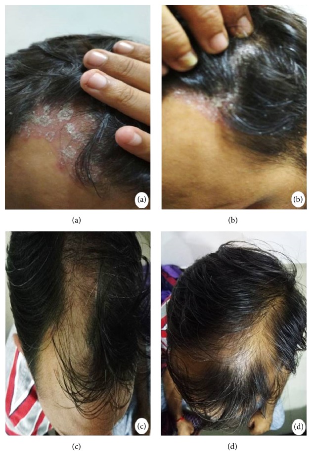 在間充質(zhì)干細胞移植治療之前,患者的頭皮顯示出大量紅斑,并帶有粘附的銀色薄片 (a, b)。在局部應(yīng)用間充質(zhì)干細胞移植一個月后記錄的銀屑病消退和炎性紅斑斑完全清除 (c, d)。
