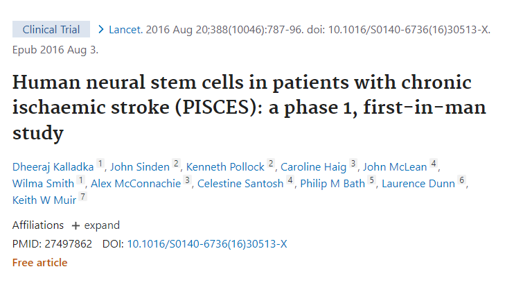 一項關于神經干細胞移植治療中風患者的為期兩年的開放標簽、單中心和劑量遞增臨床試驗(NCT01151124)已經完成。臨床數據分析表明,高達2000萬個細胞的單次腦內神經干細胞劑量不會引起不良事件,并且與神經功能改善有關。