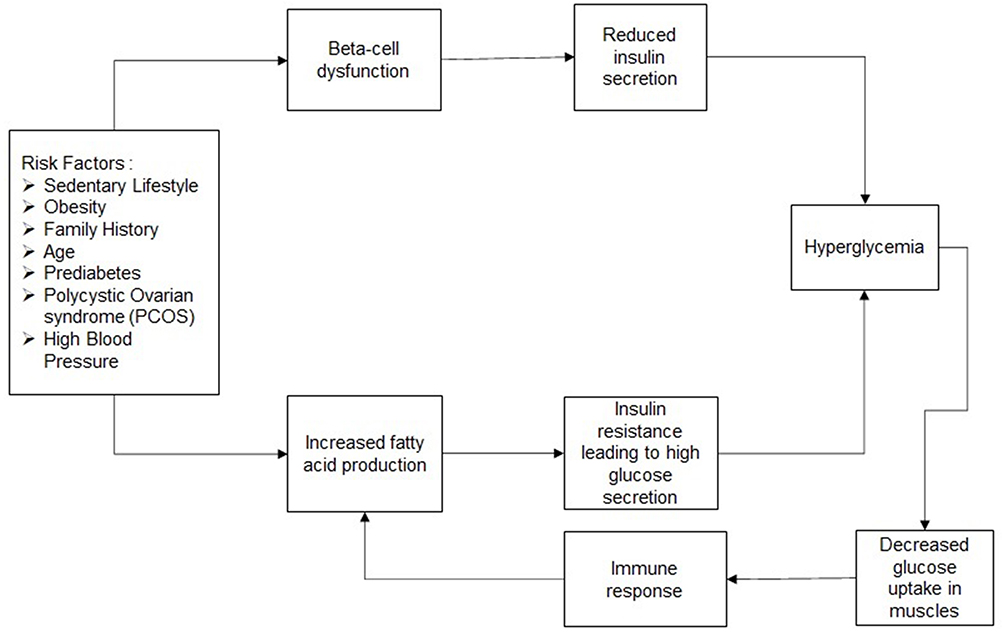 T2DM:如上所述,T2DM歸因于多種風險因素。這些因素會在一段時間內導致β細胞功能障礙。β細胞的低容量或功能障礙會減少胰腺的胰島素分泌,進而導致高血糖癥。這些風險因素還會導致肝臟產生更多的脂肪酸,從而導致肝臟中形成大量葡萄糖分泌物。葡萄糖分泌增加會降低胰島素的功能并導致胰島素抵抗。高血糖導致肌肉吸收的葡萄糖量低,并引起免疫反應。這會進一步損害肝臟并增加胰島素抵抗。