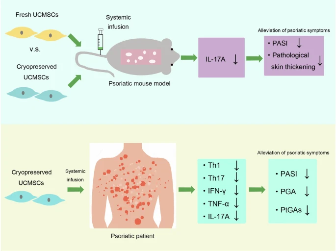 綜合起來(lái),這些數(shù)據(jù)表明冷凍保存的UCMSCs對(duì)銀屑病表現(xiàn)出極大的有益作用。