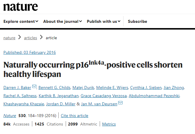 2016年2月,《Nature》雜志刊登了美國梅奧診所分子生物學家Baker的最新成果:以NK細胞為主的免疫細胞清除衰老細胞可使動物壽命延長20%-30%。