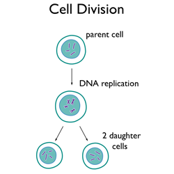 大多數細胞分裂。在分裂前不久,DNA復制,然后細胞分裂成兩個子細胞。每個細胞都有原始細胞的 DNA、細胞質和細胞膜的完整副本。