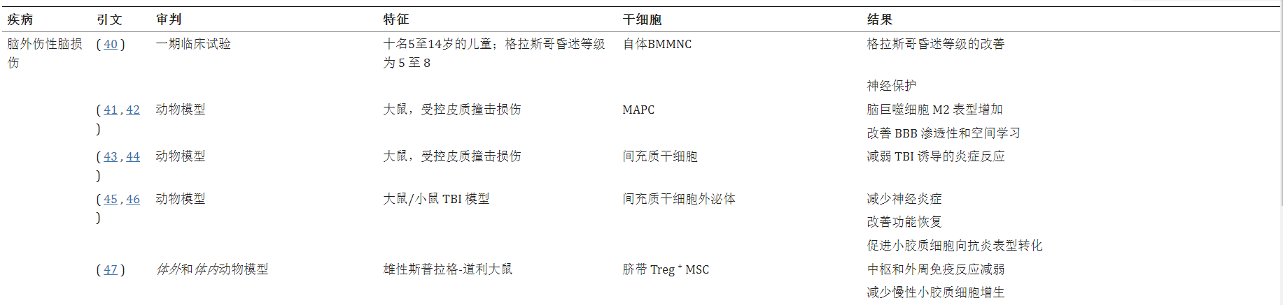 TBI是由于外部損傷導(dǎo)致大腦損傷和炎癥而發(fā)生的。TBI的特點(diǎn)是急性期炎癥,可引發(fā)慢性繼發(fā)性神經(jīng)炎癥的細(xì)胞級(jí)聯(lián)反應(yīng)。在美國(guó),2014年報(bào)告了287萬(wàn)例TBI病例,其中超過(guò)837,000例涉及兒科。在美國(guó),估計(jì)有1350萬(wàn)人因創(chuàng)傷性腦損傷而致殘。使用BMMNC、MAPC和MSC進(jìn)行治療性干細(xì)胞療法在改善預(yù)后和限制繼發(fā)性損傷方面顯示出有希望的結(jié)果。干細(xì)胞療法已被證明可以調(diào)節(jié)TBI中的細(xì)胞反應(yīng)和炎癥級(jí)聯(lián)反應(yīng)。