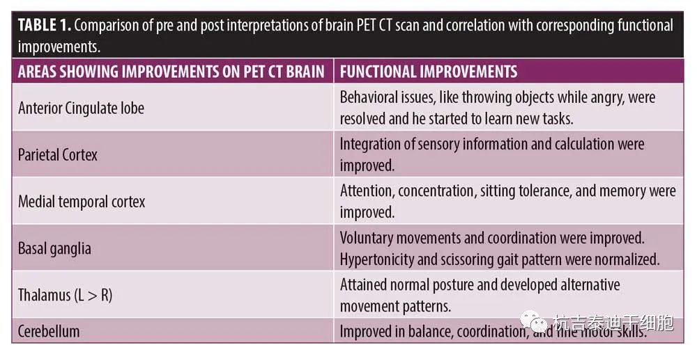 在認(rèn)知上,由于他定期上學(xué),他的注意力持續(xù)時(shí)間和坐姿耐受力也得到了改善。GMFM分?jǐn)?shù)從60.67提高到67。GMFCS等級(jí)由3級(jí)提升至2級(jí);FIM評(píng)分從97分提高到99分。比較第一次細(xì)胞治療之前和之后7個(gè)月期間進(jìn)行的腦部PET CT掃描結(jié)果,發(fā)現(xiàn)前扣帶回葉、頂葉皮層、內(nèi)側(cè)顳葉皮層、丘腦、基底神經(jīng)節(jié)和小腦(表1)。