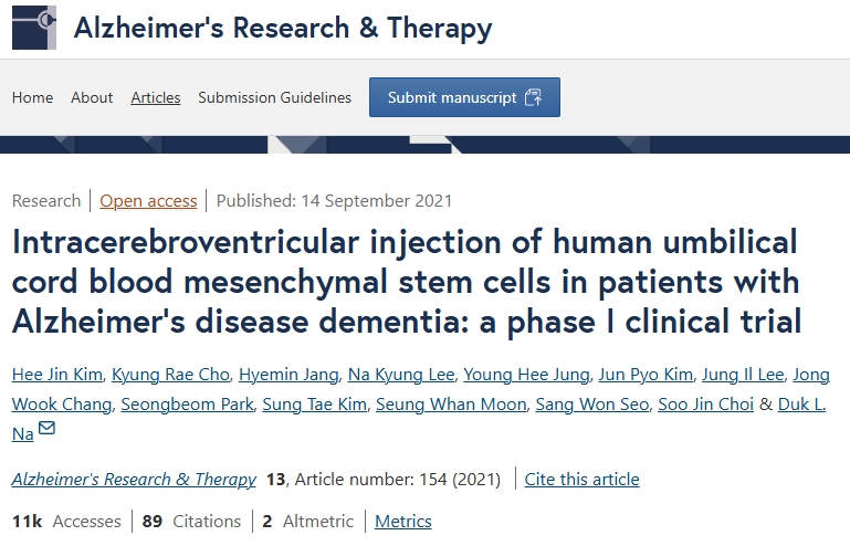 2021年:腦室內(nèi)注射人臍血間充質(zhì)干細胞治療阿爾茨海默病癡呆患者:I期臨床試驗