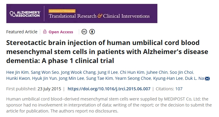 2015年:立體定向腦注射人臍血間充質(zhì)干細胞治療阿爾茨海默病癡呆患者:1期臨床試驗