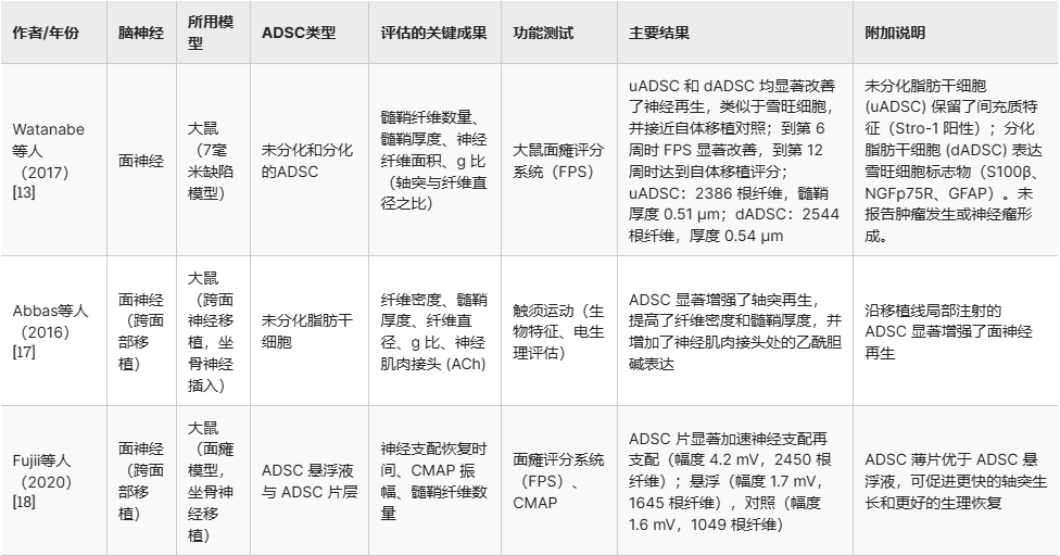 - 面神經:觸須運動評分和面癱評分系統均顯示ADSC組功能顯著改善;動物實驗證實dADSC使觸須運動角度提升近5倍(9.22°vs1.90°)。