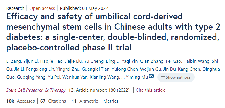[4]Zang L, Li Y, Hao H, Liu J, Cheng Y, Li B, Yin Y, Zhang Q, Gao F, Wang H, Gu S, Li J, Lin F, Zhu Y, Tian G, Chen Y, Gu W, Du J, Chen K, Guo Q, Yang G, Pei Y, Yan W, Wang X, Meng J, Zhang S, Ba J, Lyu Z, Dou J, Han W, Mu Y. Efficacy and safety of umbilical cord-derived mesenchymal stem cells in Chinese adults with type 2 diabetes: a single-center, double-blinded, randomized, placebo-controlled phase II trial. Stem Cell Res Ther. 2022 May 3;13(1):180. doi: 10.1186/s13287-022-02848-6. PMID: 35505375; PMCID: PMC9066971.