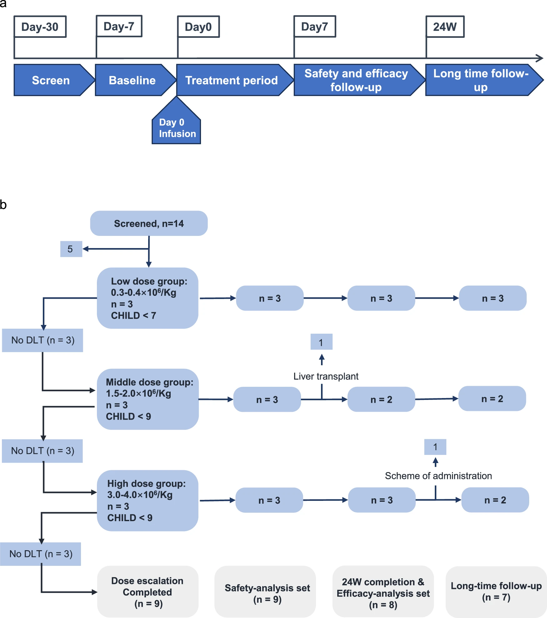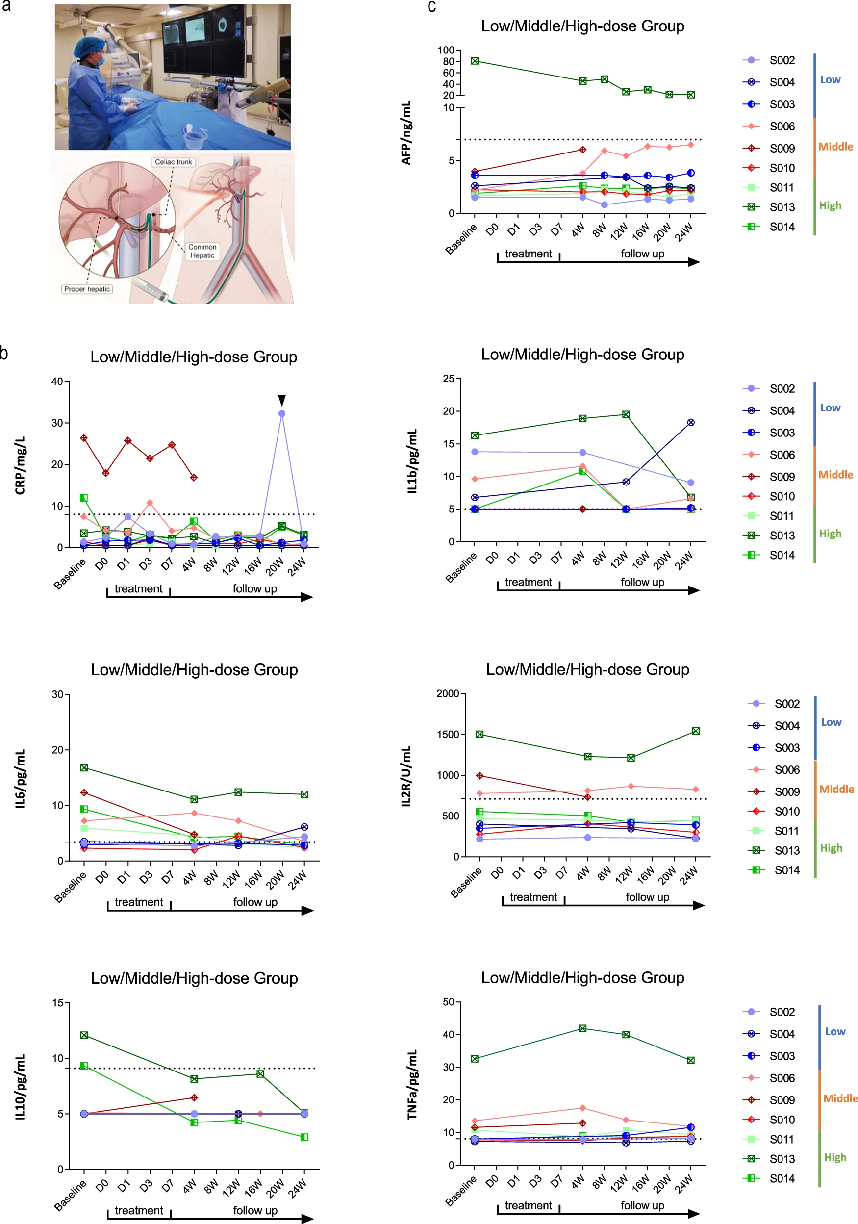 該研究在2021年12月27日至2022年12月14日期間,共招募并篩選了14例病因各異的肝硬化患者。其中9例患者接受了經(jīng)肝動(dòng)脈輸注HepLPCs的治療,劑量遞增:低劑量組(0.3–0.4×10?/kg)、中劑量組(1.5–2.0×10?/kg)和高劑量組(3.0–4.0×10?/kg)(圖4、5a)。