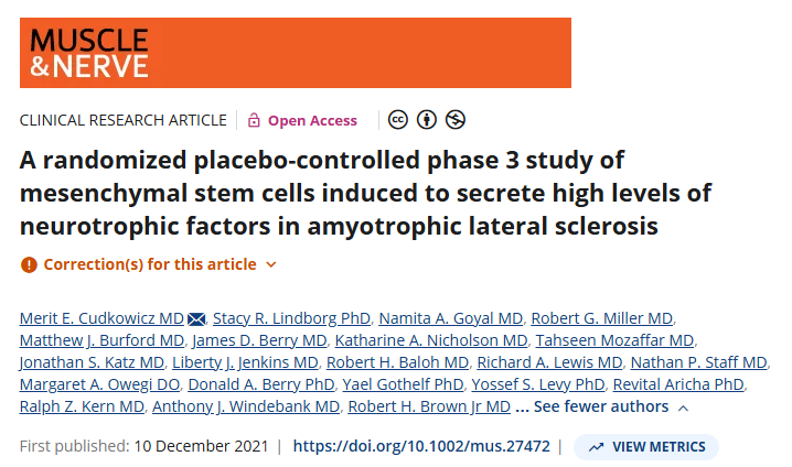 2021年,《肌肉與神經主頁》發表了一項“隨機、安慰劑對照的3期臨床研究,旨在評估間充質干細胞誘導分泌高水平神經營養因子治療肌萎縮側索硬化癥的效果[2]。