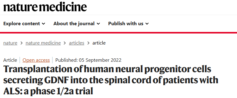 2022年,一項將分泌GDNF的人類神經祖細胞移植到ALS患者脊髓中:一項1/2a期試驗表明,將分泌GDNF的人類神經祖細胞(CNS10-NPC-GDNF)移植到脊髓中,在42個月內是可行且安全的,并且未對運動功能產生負面影響[3]。