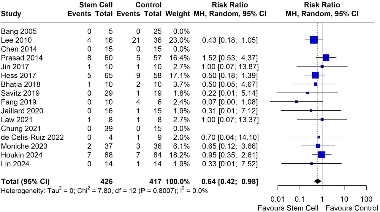 在安全性評估方面,結果顯示出積極信號。死亡率數據顯示,干細胞治療組的死亡風險顯著低于對照組(圖3),相對危險度為0.64(95%CI 0.42至0.98, p=0.040),且各研究間無異質性(I2=0%)。