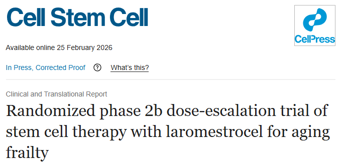 [1]:Ruiz JG, Oliva AA Jr, Ramdas KN, et al. Randomized phase 2b dose-escalation trial of stem cell therapy with laromestrocel for aging frailty. Cell Stem Cell. 2026 Feb:S1934-5909(26)00040-8. DOI: 10.1016/j.stem.2026.01.017. PMID: 41747733.