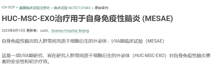盡管臨床前數據令人鼓舞,外泌體療法在風濕病領域的臨床試驗尚處于早期探索階段。目前,一項I/IIA期研究(MESAE,NCT07131683)正在評估人臍帶MSC來源外泌體(HUC-MSC-EXO)在自身免疫性腦炎患者中的安全性和初步療效,采用鼻內給藥方案,包含三個劑量隊列的劑量爬坡階段和一個隨機雙盲安慰劑對照的擴展階段[6]。