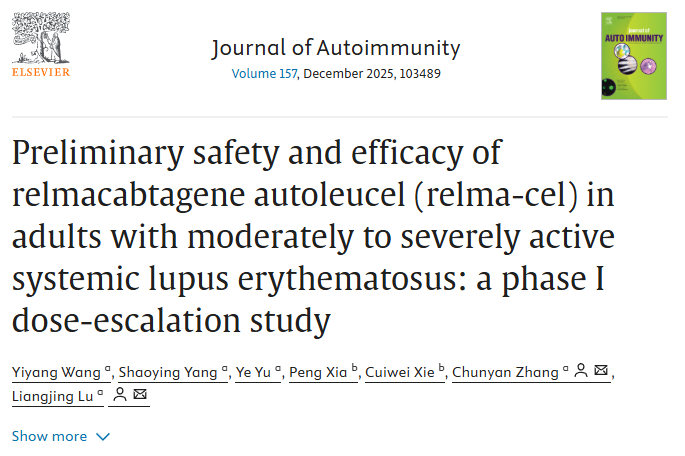 在SLE領域,2025年12月,另一項I期劑量遞增研究(NCT06551142)評估了relmacabtagene autoleucel(relma-cel)——一種CD19 CAR-T細胞產品——在中重度活動性SLE中的安全性和有效性。8例女性患者在接受氟達拉濱和環磷酰胺預處理后接受了單次CAR-T細胞輸注(劑量范圍為50×10?至100×10?)[5]。