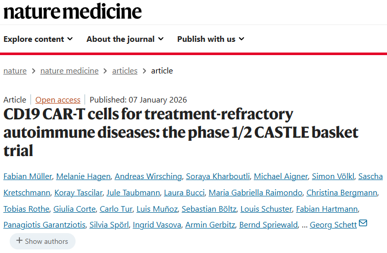 [4]:Müller, F., Hagen, M., Wirsching, A. et al. CD19 CAR-T cells for treatment-refractory autoimmune diseases: the phase 1/2 CASTLE basket trial. Nat Med 32, 1142–1151 (2026). https://doi.org/10.1038/s41591-025-04185-6