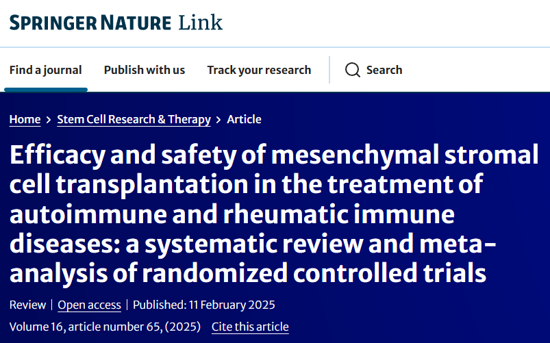 [2]:Zeng, L., Liu, C., Wu, Y.?et al.?Efficacy and safety of mesenchymal stromal cell transplantation in the treatment of autoimmune and rheumatic immune diseases: a systematic review and meta-analysis of randomized controlled trials.?Stem Cell Res Ther?16, 65 (2025). https://doi.org/10.1186/s13287-025-04184-x
