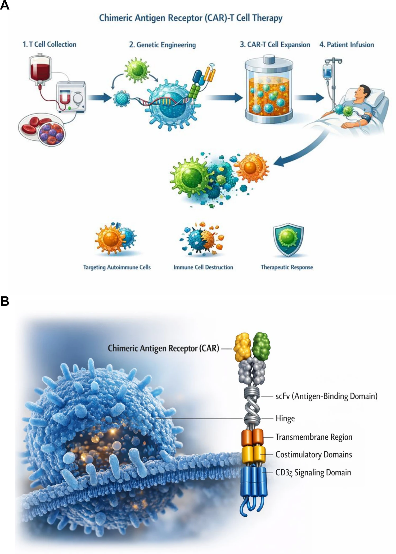 CAR-T細胞療法是免疫療法的前沿技術,最初用于血液腫瘤,現正被探索作為自身免疫性疾病的一種變革性手段。其核心是對患者自身的T細胞進行基因工程改造,使其表達嵌合抗原受體(CAR),從而識別并清除驅動疾病病理的自身反應性B細胞或T細胞(圖1)。