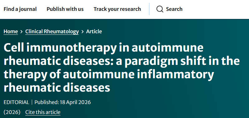 [1]:Chikanza, I.C., Sakkas, L.I. Cell immunotherapy in autoimmune rheumatic diseases: a paradigm shift in the therapy of autoimmune inflammatory rheumatic diseases. Clin Rheumatol (2026). https://doi.org/10.1007/s10067-026-08103-0