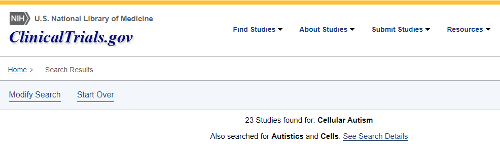 2023年5月,使用搜索詞 “自閉癥譜系障礙和細胞療法 “對美國NIH臨床試驗數據庫(clinicaltrials.gov)進行了搜索,發現了23項。