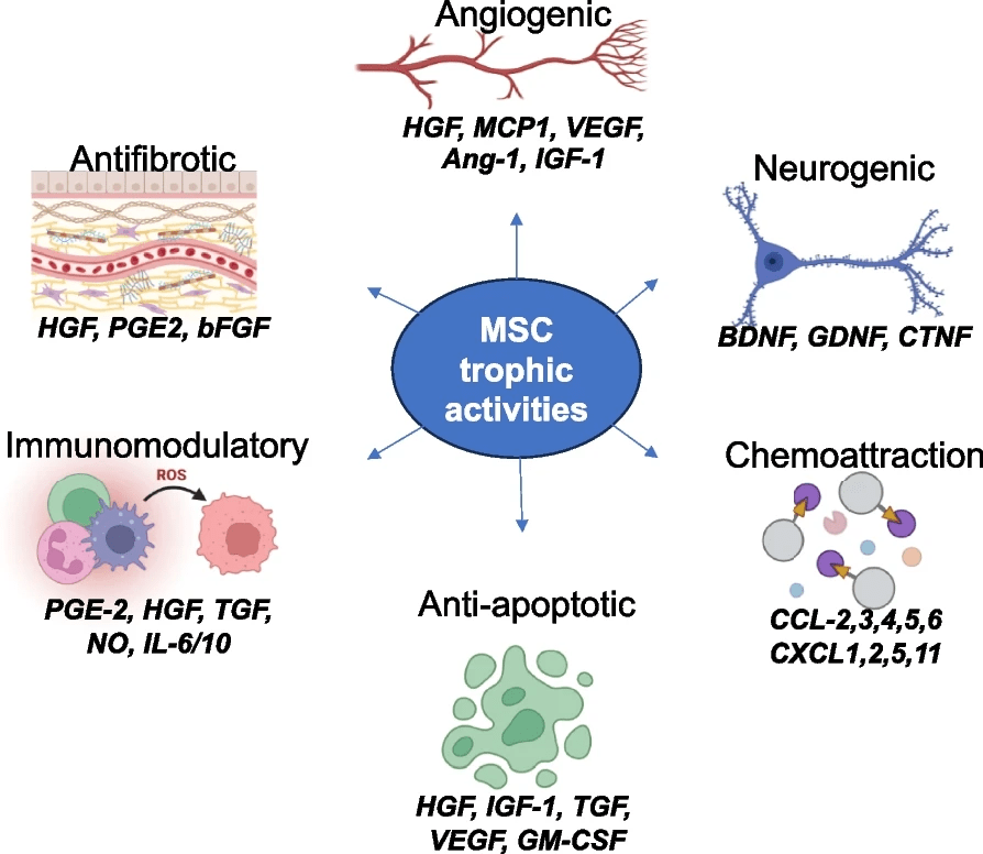 具體而言,已知MSC分泌的因子可介導血管生成、有絲分裂、抗纖維化、抗凋亡、抗瘢痕形成和神經源性功能(圖1)。