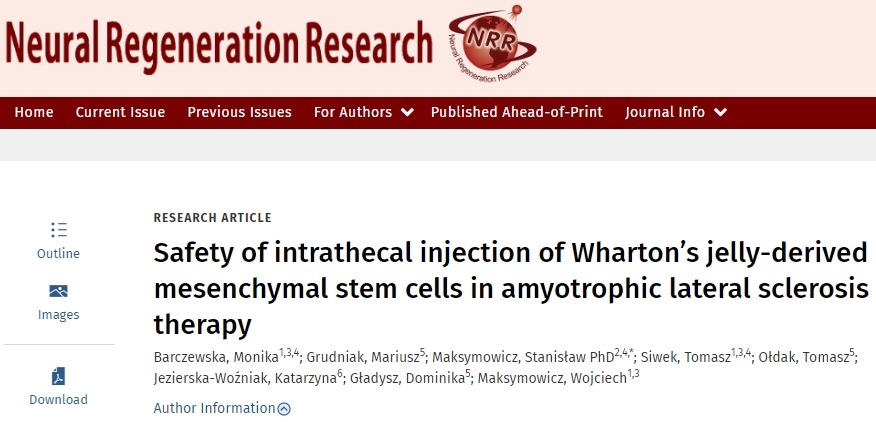 2019年,波蘭馬祖里大學醫學院神經內科對43名ALS患者的頸部、腰部和胸部每月注射兩次平均0.42×10^6WJ-MSC,未顯示任何不良反應,注射MSCs(占鞘內和肌肉內注射的組合)的患者的ALS功能評定量表-復蘇評分和用力肺活量降低的速度。證實了MSC治療的安全性和有效性。