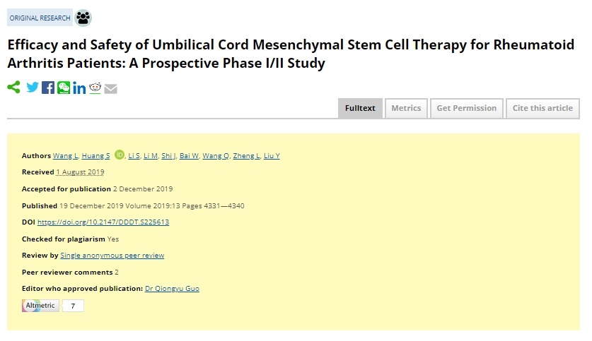 在最近的臨床試驗中,MSC治療RA患者已顯示出積極的結果。對64名確診為RA的患者注射UC-MSC(總劑量4×10^7個細胞)。