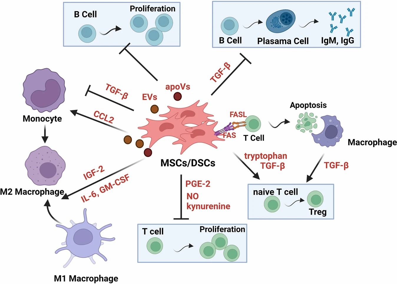 • 旁分泌作用:間充質(zhì)干細(xì)胞能夠分泌多種細(xì)胞因子和生長因子,如血管內(nèi)皮生長因子(VEGF)、成纖維細(xì)胞生長因子(FGF)等,這些因子參與免疫調(diào)控、抗炎治療和組織修復(fù)。