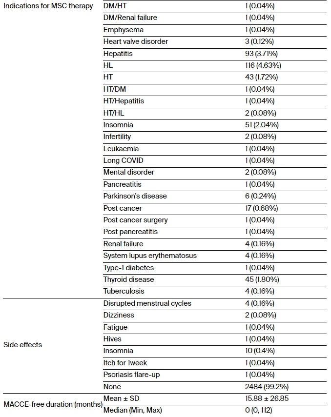 不良反應:大多數接受MSC治療的患者(n=2484,99.2%)沒有出現任何不良反應(表1)。最常見的不良反應是失眠(n=10,0.4%),其次是月經紊亂(n=4,0.16%)和頭暈(n=2,0.08%)。重要的是,這些不良反應都不是嚴重的。