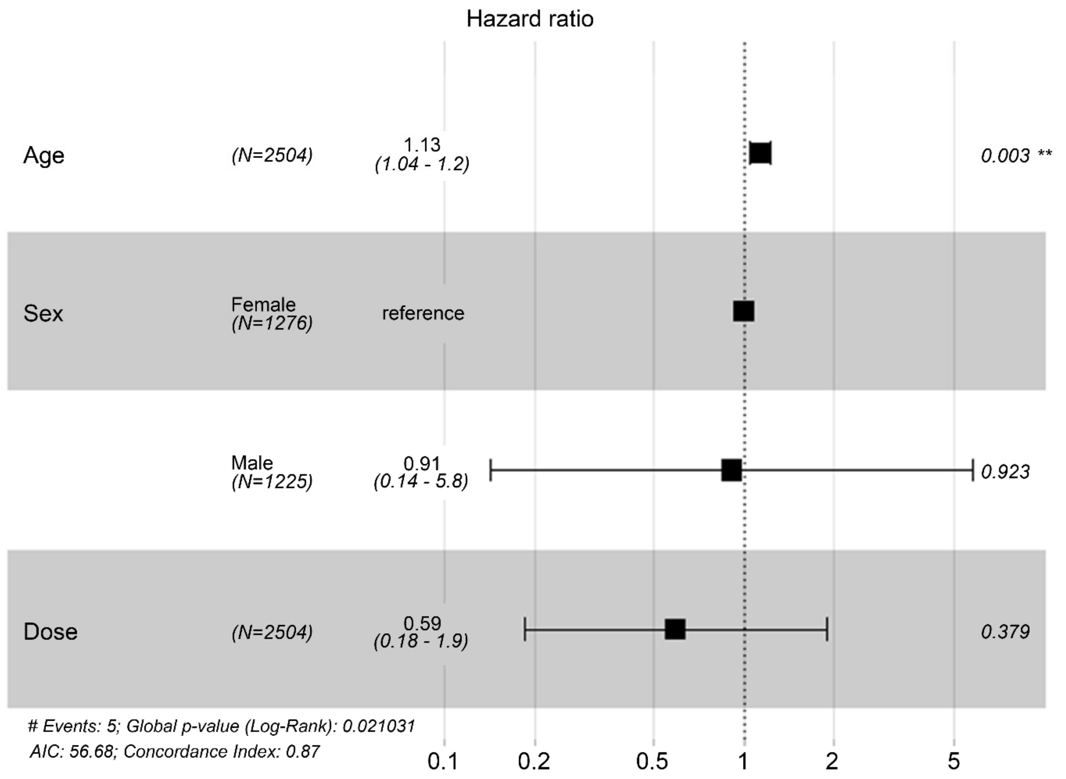 具體而言,年齡每增加一歲,重大不良心腦血管事件風險增加1.124。在包含相同三個變量的多變量Cox比例風險回歸分析中,年齡仍然與重大不良心腦血管事件風險顯著相關(表4和圖2),即年齡每增加一歲,重大不良心腦血管事件風險增加1.127。性別和間充質干細胞劑量在多變量分析中仍然不顯著。