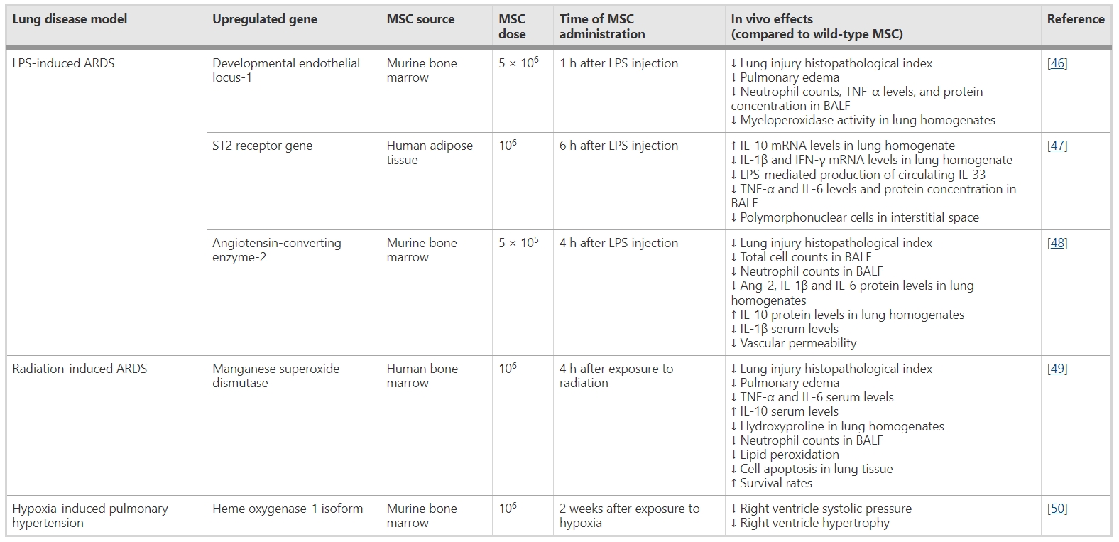 針對ARDS進行基因轉導的情況 ARDS是此類技術常見的治療目標,為有效逆轉炎癥過程,MSCs被轉導了以下幾種基因: