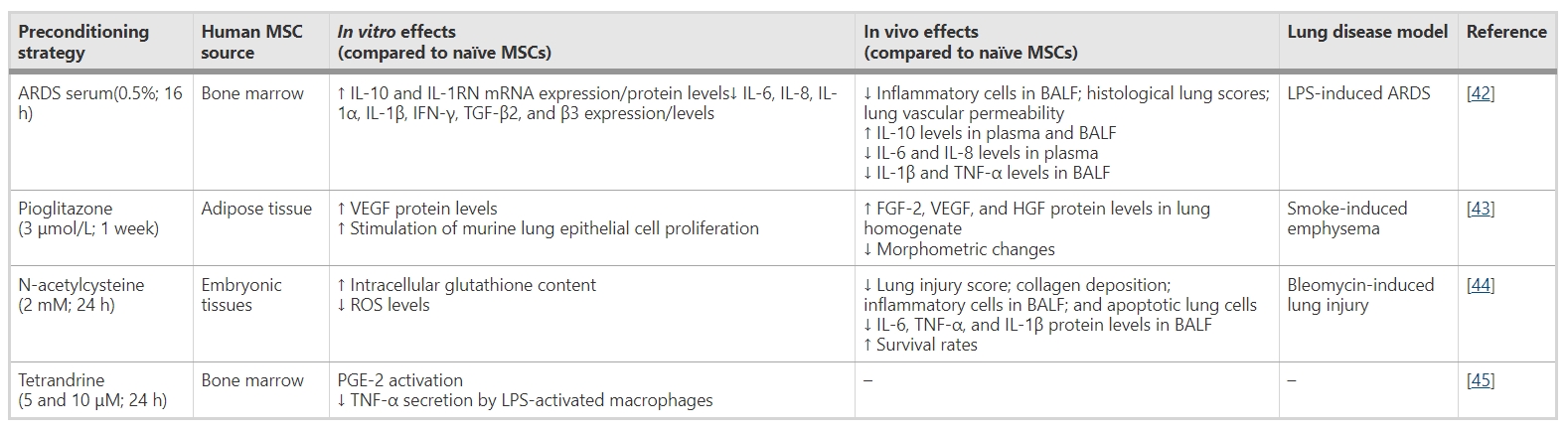 參考資料:Silva, L.H.A., Antunes, M.A., Dos Santos, C.C.?et al.?Strategies to improve the therapeutic effects of mesenchymal stromal cells in respiratory diseases.?Stem Cell Res Ther?9, 45 (2018). https://doi.org/10.1186/s13287-018-0802-8
