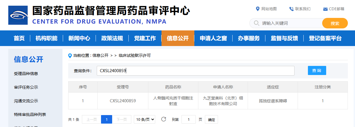 2025年3月11日,國(guó)家藥監(jiān)局藥品審評(píng)中心(CDE)官網(wǎng)公示,九芝堂美科(北京)細(xì)胞技術(shù)有限公司(簡(jiǎn)稱“九芝堂美科”)申報(bào)的“人骨髓間充質(zhì)干細(xì)胞注射液”獲批臨床IND,適應(yīng)癥為“孤獨(dú)癥譜系障礙”。