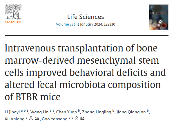 2023年12月3日,九芝堂美科在國(guó)際知名學(xué)術(shù)期刊《Life Sciences》發(fā)表研究論文《骨髓間充質(zhì)干細(xì)胞靜脈移植改善BTBR小鼠的行為缺陷并糾正其糞便微生物群組成》,關(guān)于人骨髓間充質(zhì)干細(xì)胞(hBMMSC)治療自閉癥的臨床前藥效學(xué)研究。