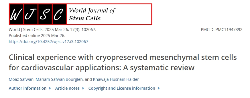 [1]:Clinical experience with cryopreserved mesenchymal stem cells for cardiovascular applications: A systematic review World Journal of Stem Cells. 2025 Mar;17(3). PMCID: PMC11947892.