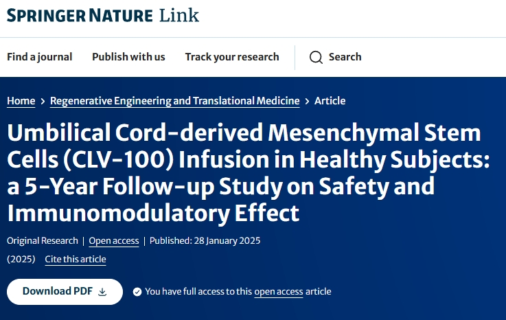 近日,國際醫學期刊雜志《Regenerative Engineering and Translational Medicine》發表了一篇“臍帶間充質干細胞(CLV-100)輸注于健康受試者:安全性和免疫調節效果的5年隨訪研究”的臨床試驗文章[1]。