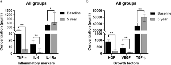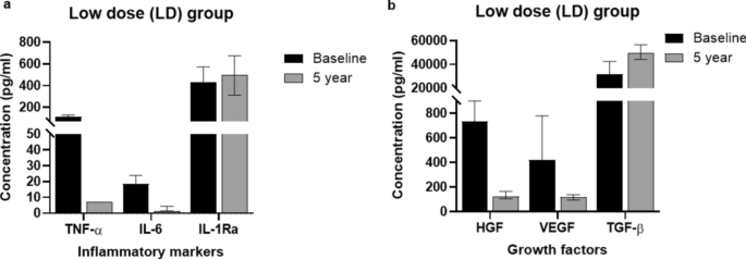 HD組在5年隨訪中維持了更強的抗炎表型:IL-1Ra水平較基線持續升高,且顯著高于LD組。同時,HD組的HGF水平和TGF-β升高趨勢更明顯,表明高劑量輸注可能通過持續調控HGF/TGF-β通路增強組織修復潛力(圖3b、5)。