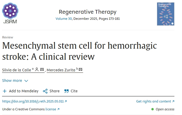 [1]Calle S, Zurita M. Mesenchymal stem cell for hemorrhagic stroke: A clinical review. Regenerative Therapy. 2025 Dec;30:173-181. DOI: 10.1016/j.reth.2025.05.011. PMID: 40575346; PMCID: PMC12197982.