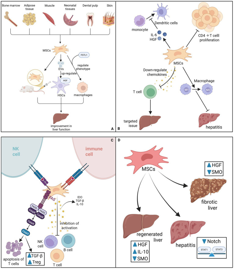 間充質干細胞(MSCs)在肝病治療中的作用并非依賴單一通路,而是通過協同網絡重塑病理微環境。MSCs并非僅作為細胞替代物,而是以“藥用信號細胞”的身份,通過四個層級協調組織修復:免疫調節、直接抗纖維化干預、促進再生與新興代謝調控。