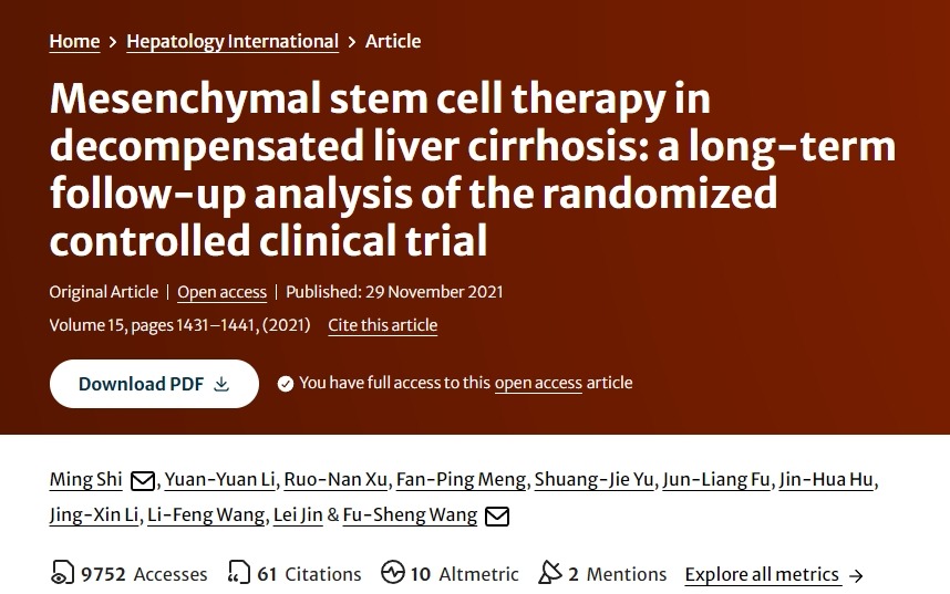 Shi, M., Li, YY., Xu, RN.?et al.?Mesenchymal stem cell therapy in decompensated liver cirrhosis: a long-term follow-up analysis of the randomized controlled clinical trial.?Hepatol Int?15, 1431–1441 (2021). https://doi.org/10.1007/s12072-021-10199-2