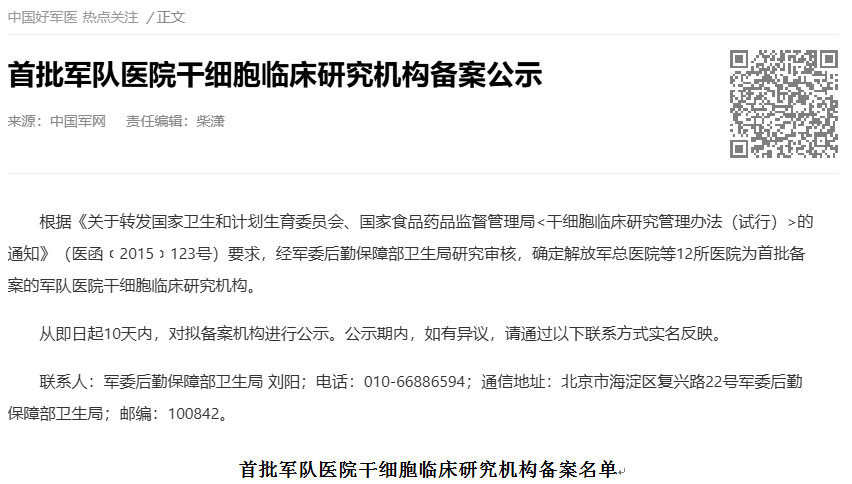 近日傳來好消息,根據《干細胞臨床研究管理辦法(試行)》(國衛科教發〔2015〕48號)要求,經過中央軍委后勤保障部衛生局的嚴格審核,全國有23家軍隊醫院獲得了干細胞臨床研究的備案資格。這標志著中國在干細胞研究和應用方面邁出了堅實的一步,同時也彰顯了軍隊醫療機構在此領域的領先地位。