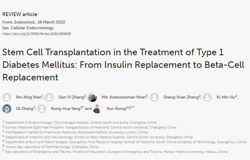 2022年,中南大學湘雅三醫院在《frontiersin》醫學雜志子刊《Frontiers in Endocrinology》上發布了一篇《干細胞移植治療1型糖尿?。簭囊葝u素替代到β細胞替代》的綜述,該綜述表示在最近的研究中,干細胞通過重建免疫耐受性和保留胰島β細胞功能已證明具有治療1型糖尿病的潛在功效。cGMP級干細胞產品已用于人體臨床試驗,表明干細胞移植對1型糖尿病有益,無明顯不良反應。