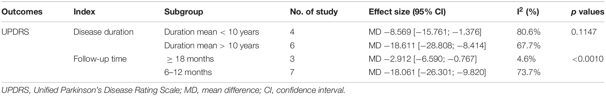 亞組分析表明,與超過18個月的隨訪相比,患者的最大改善發生在6-12個月。在納入的研究中患者的 UPDRS(運動) 得分減少用藥。關于細胞移植的療效隨隨訪時間的長短而變化,第一個應該考慮的因素是患者帕金森病的進展,這是一種運動功能隨時間下降的進行性疾病。UPDRS評估顯示帕金森病患者運動功能障礙在疾病的前5年快速進展,但在后期階段會減慢,在非階段狀態下UPDRS運動評分的年變化率為1.5–3.1%。這些結果可能與細胞移植存活、多巴胺神經元生長和發育有關。