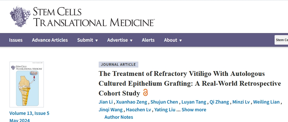 [2]Jian Li, Xuanhao Zeng, Shujun Chen, Luyan Tang, Qi Zhang, Minzi Lv, Weiling Lian, Jinqi Wang, Haozhen Lv, Yating Liu, Jiayi Shen, Taro Uyama, Fuyue Wu, Jinfeng Wu, Jinhua Xu, The Treatment of Refractory Vitiligo With Autologous Cultured Epithelium Grafting: A Real-World Retrospective Cohort Study, Stem Cells Translational Medicine, Volume 13, Issue 5, May 2024, Pages 415–424, https://doi.org/10.1093/stcltm/szae009